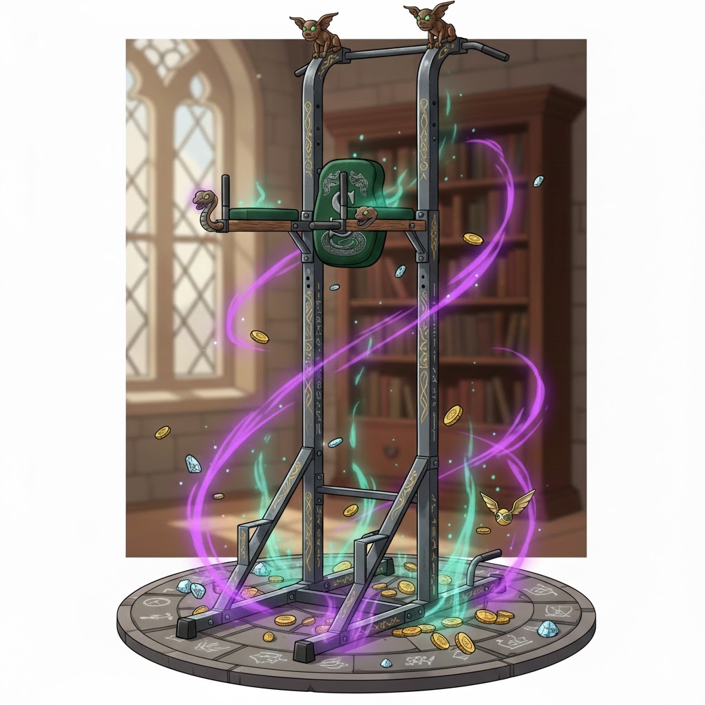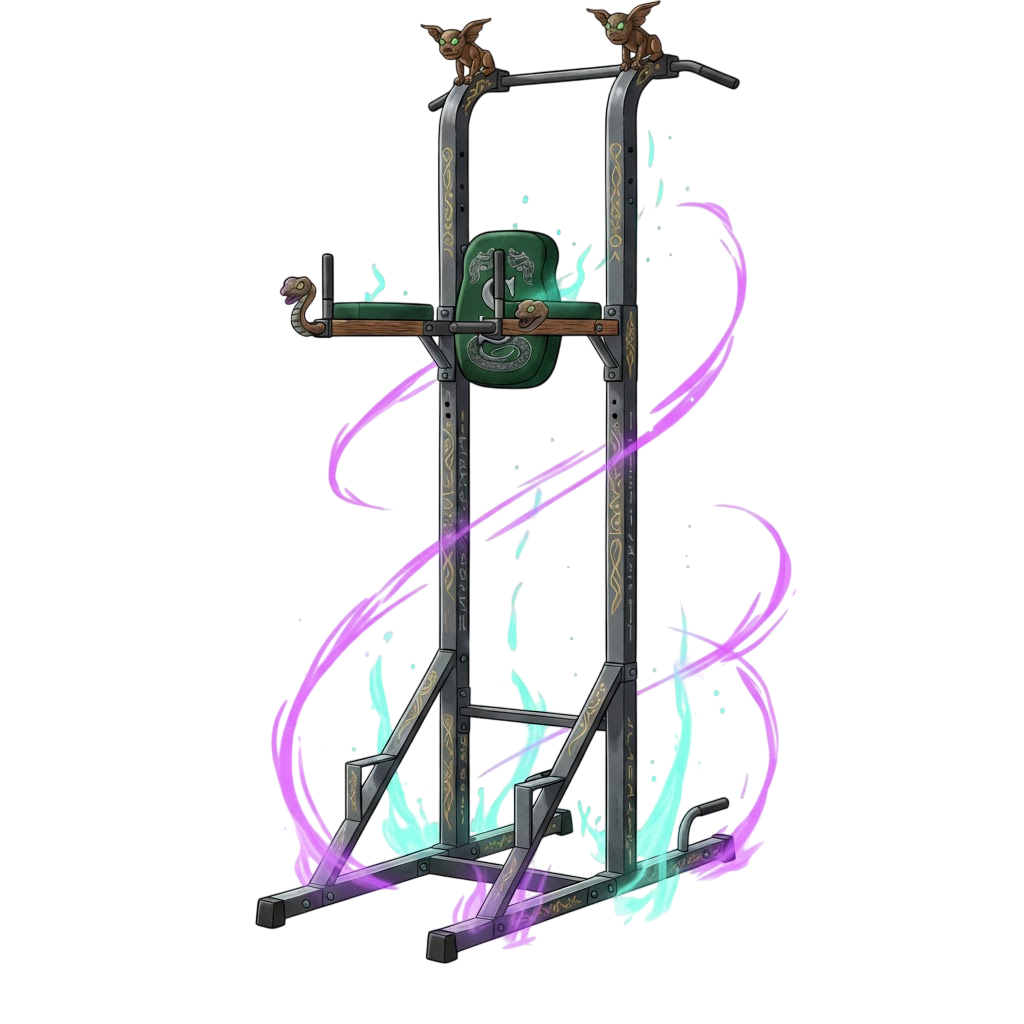 Šis treniruoklis – tai ne šiaip sporto įrenginys, o tikras Hogvartso reliktas, nukaltas iš užburto metalo, kurio neįveikė net pats Voldemortas. Sakoma, kad jis bandė jį sunaikinti tamsiausiais burtais, tačiau treniruoklis net nesudrebėjo – tik tyliai sužibo magiška aura, lyg pasišaipydamas iš Tamsiojo Valdovo pastangų. Jo konstrukcija tokia galinga, kad net drakono ugnis, paleista visu pajėgumu, nepadaro jokio poveikio – metalas lieka šaltas, tvirtas ir pasiruošęs dar vienai treniruotei. Dėl nepaprasto svorio ir magiškos energijos gabenimas į namus dažniausiai trunka ilgiau nei vieną dieną, nes paprastų vežimų čia neužtenka – prireikia papildomų slibinų, kelių apsauginių burtų ir bent vieno pavargusio burtininko, murmėjančio po nosimi, kodėl jis nepasirinko darbo bibliotekoje.